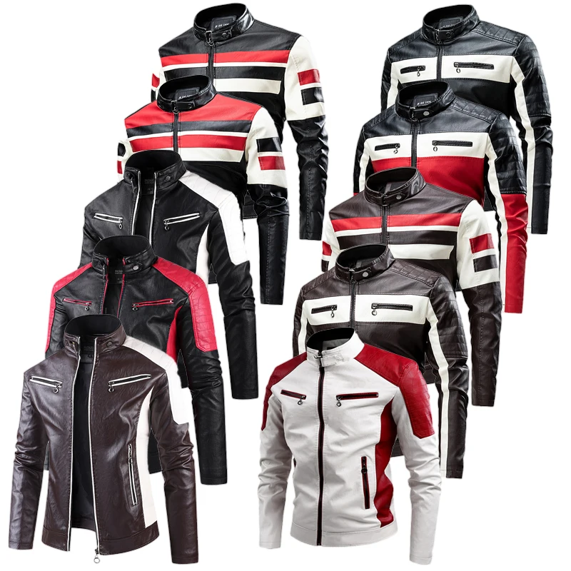2025 New Color Blocked Stand Up Collar PU Leather Motorcycle Bike Jackets for Men,multi-color Spring Autumn  Thin Casual PU Coat