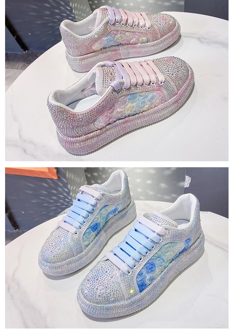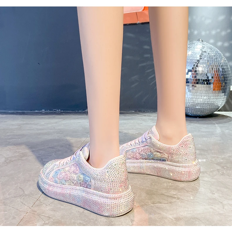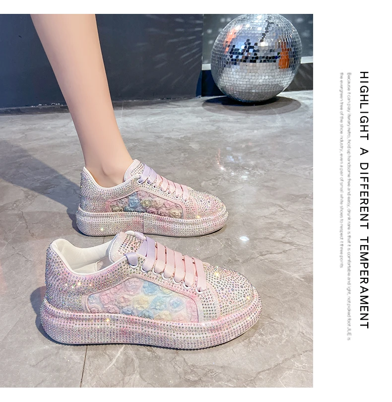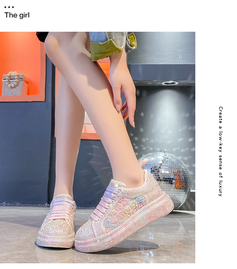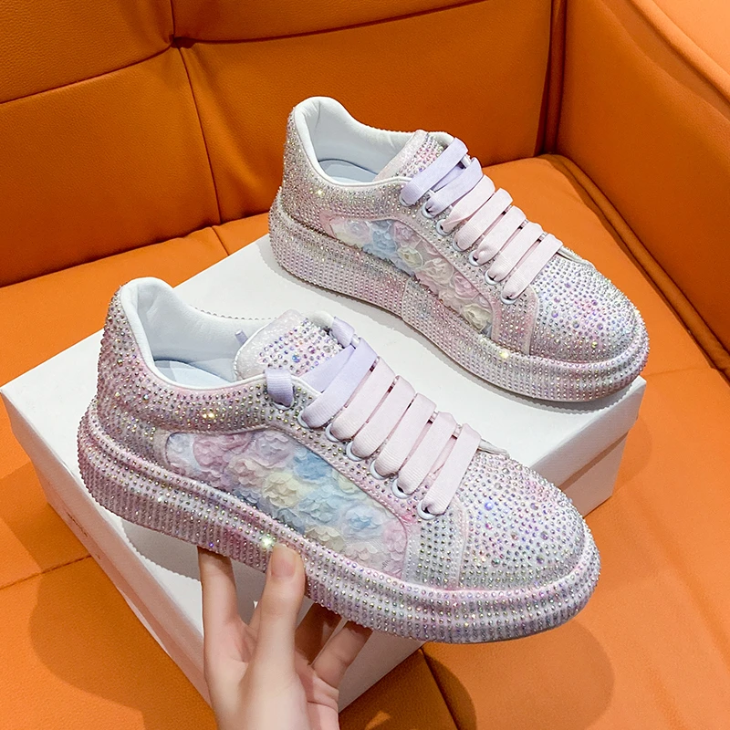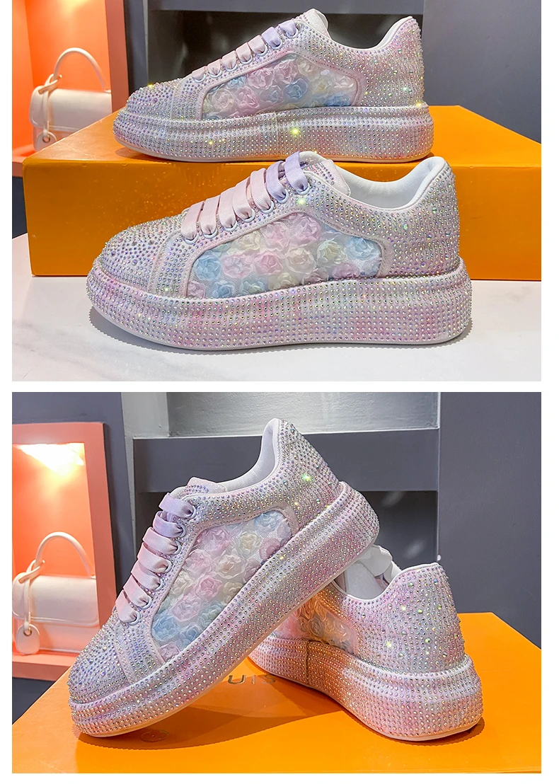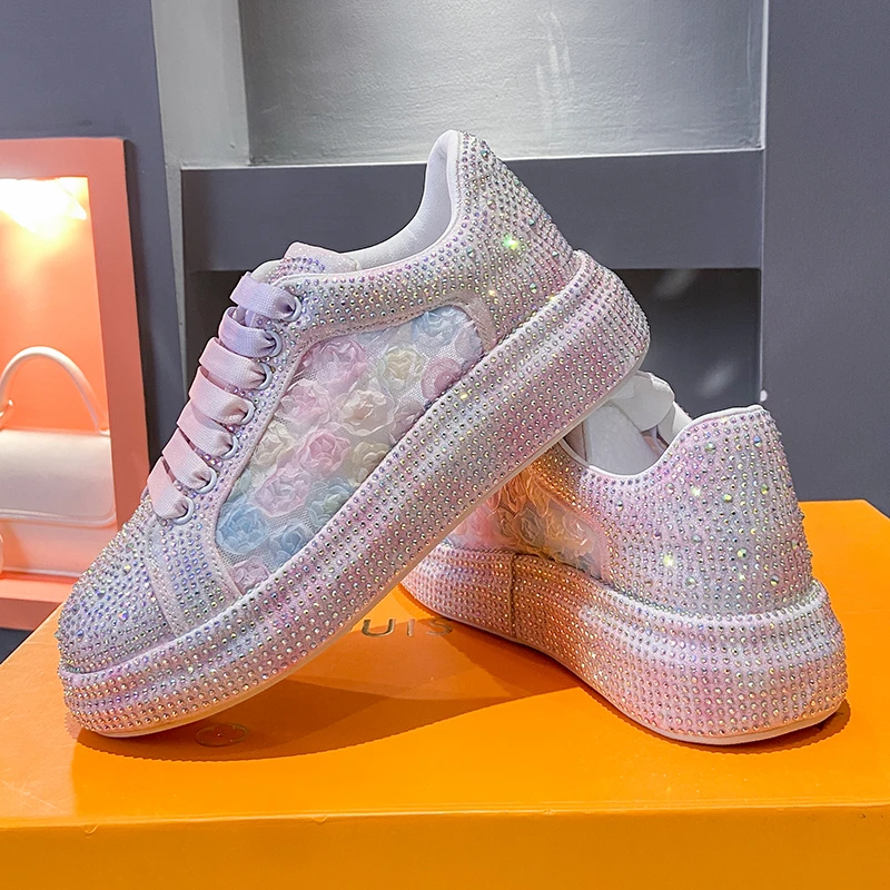 2025 Spring Autumn Women’s Fashion Pink Water Diamond Printed Shoes Luxury Thick soled Sports Shoes Designer Water Diamond Shoes