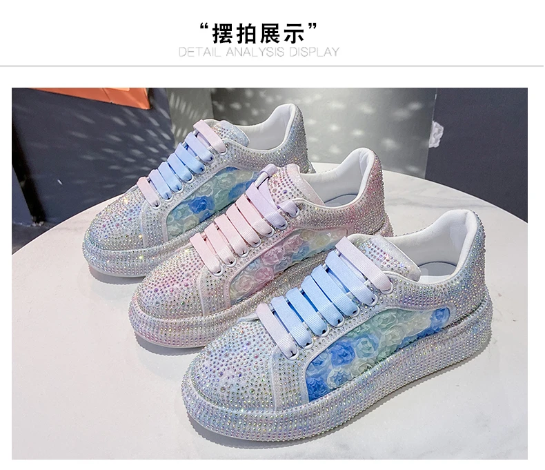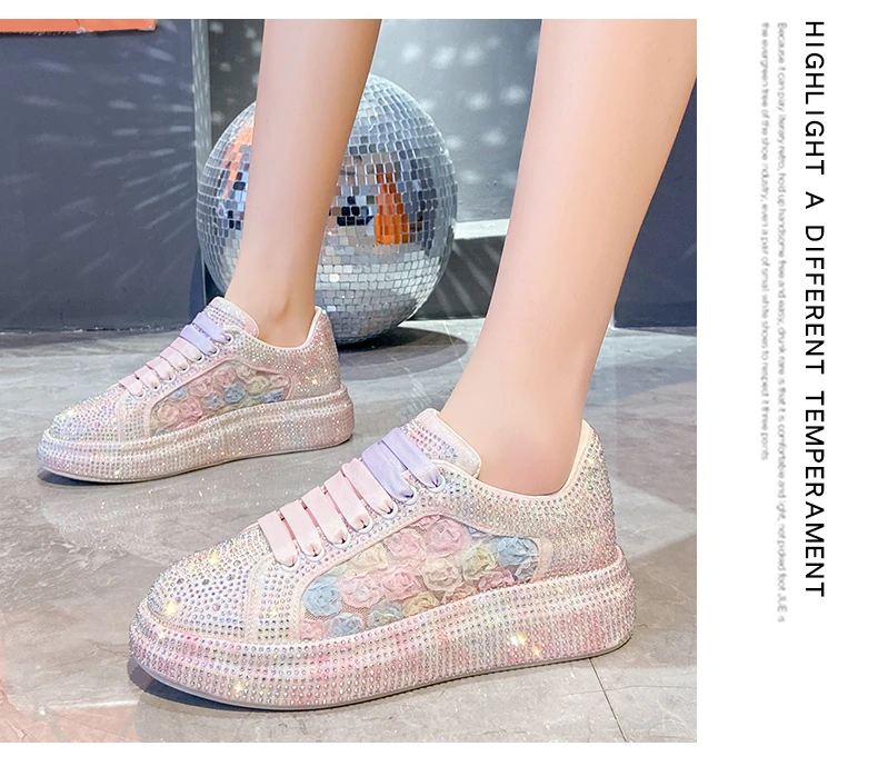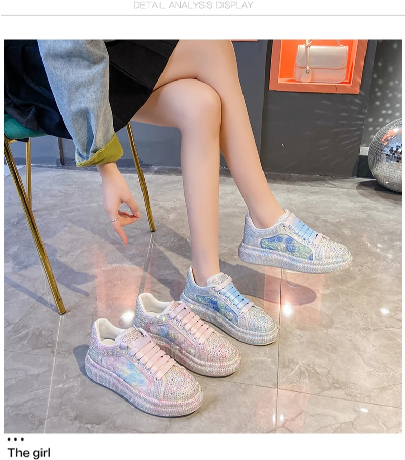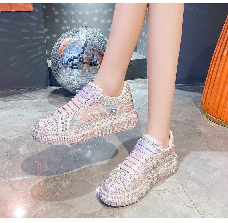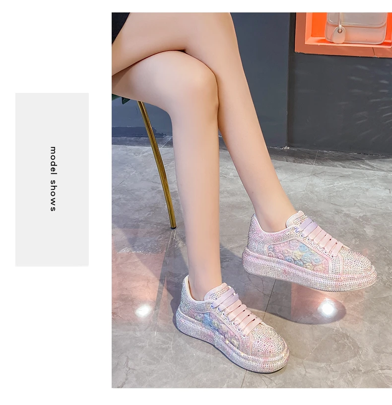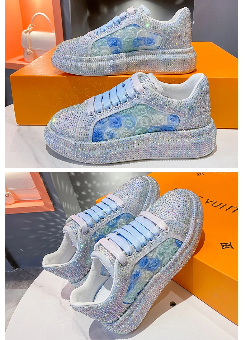 2025 Spring Autumn Women’s Fashion Pink Water Diamond Printed Shoes Luxury Thick soled Sports Shoes Designer Water Diamond Shoes