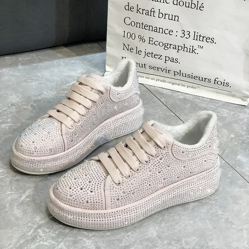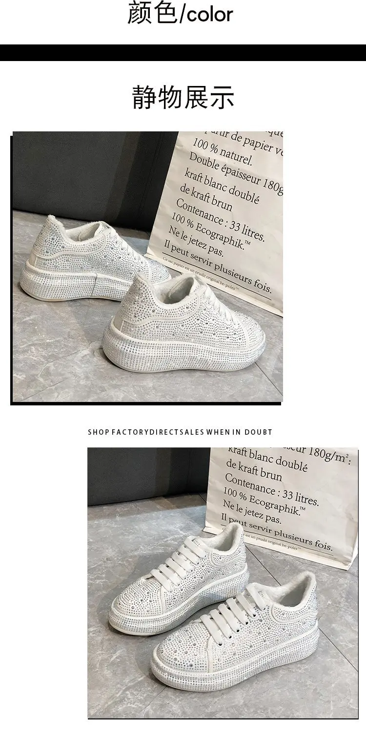 Fashion Women’s Casual Sports Shoes with Water Diamond Thick Bottom White Pink Women’s Shining Luxury Sports Shoes Trendy Shoes