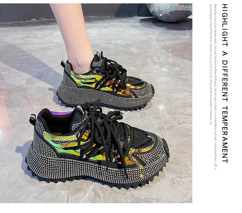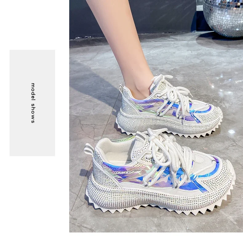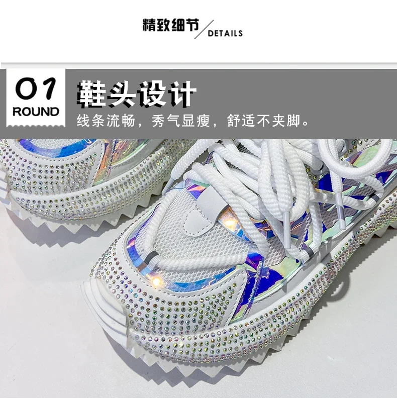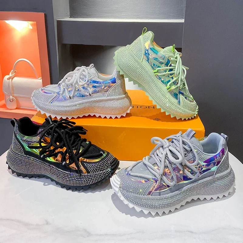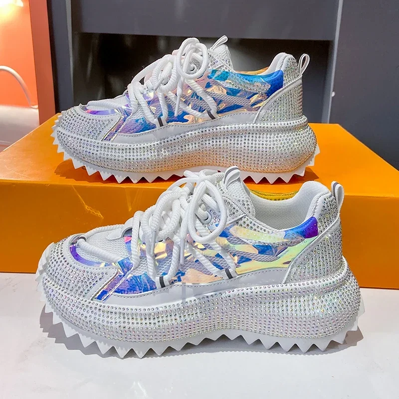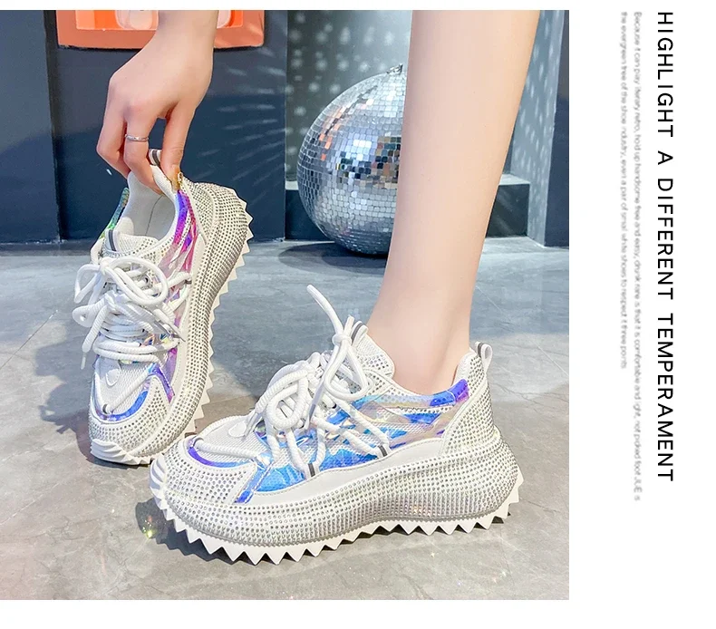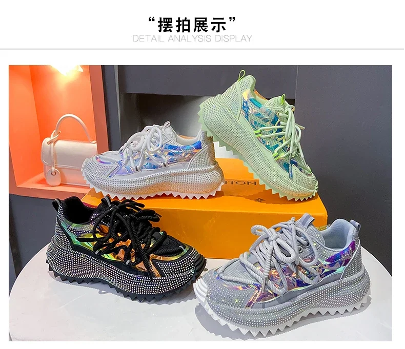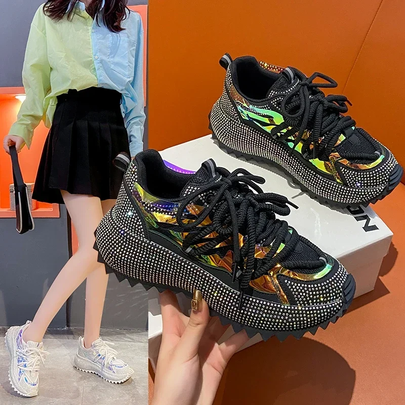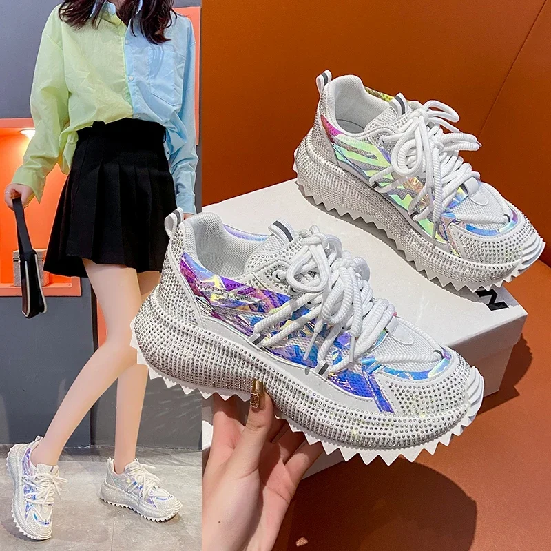 Full of Diamond Muffin Bottom Height increasing shoes Women 2024 Spring New Cross-strap Thick Sole Casual Fashion Running Shoes