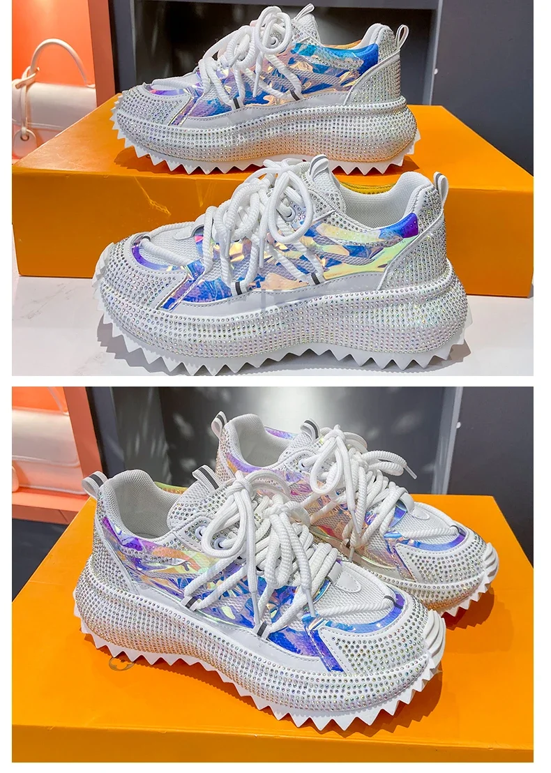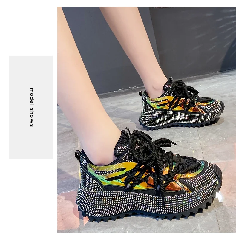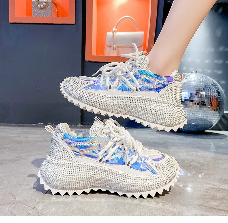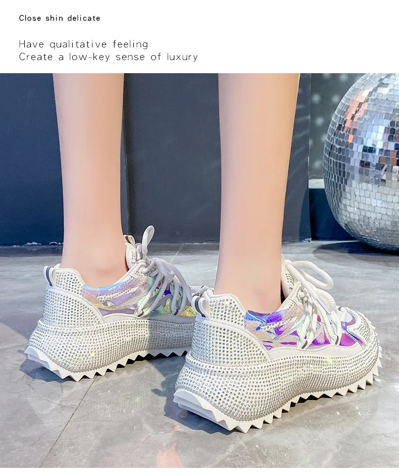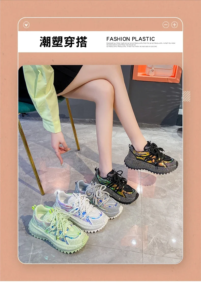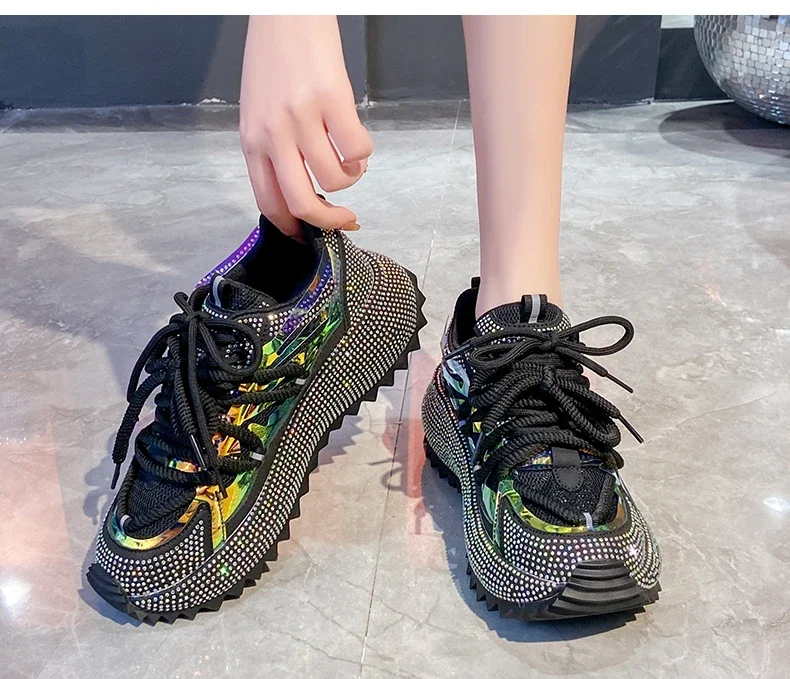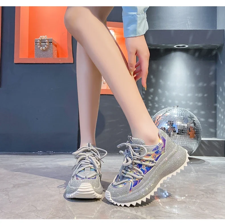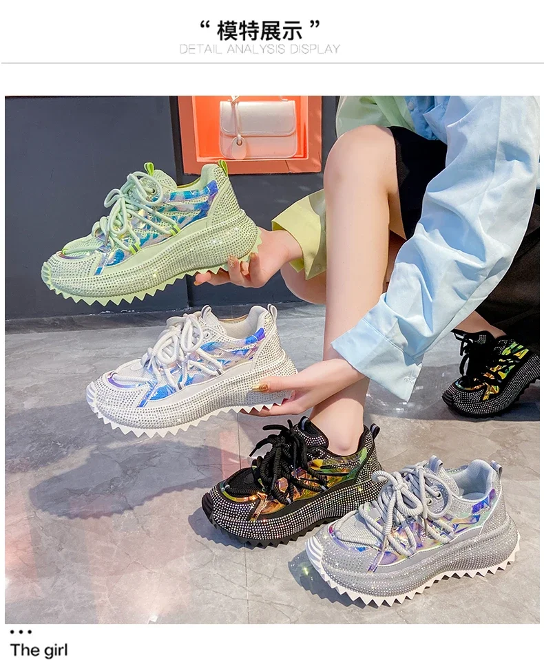 Full of Diamond Muffin Bottom Height increasing shoes Women 2024 Spring New Cross-strap Thick Sole Casual Fashion Running Shoes