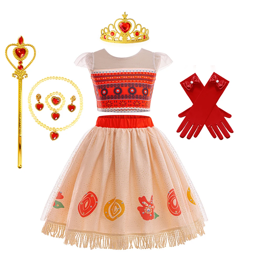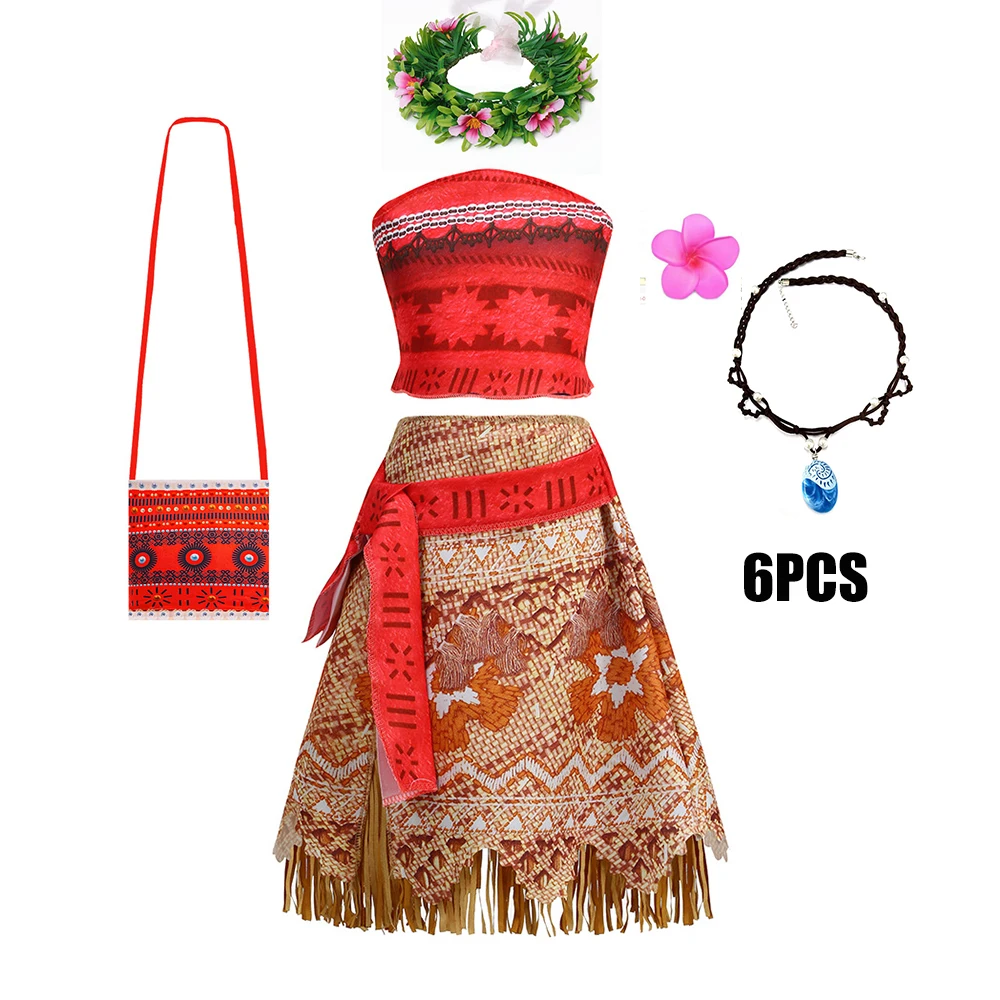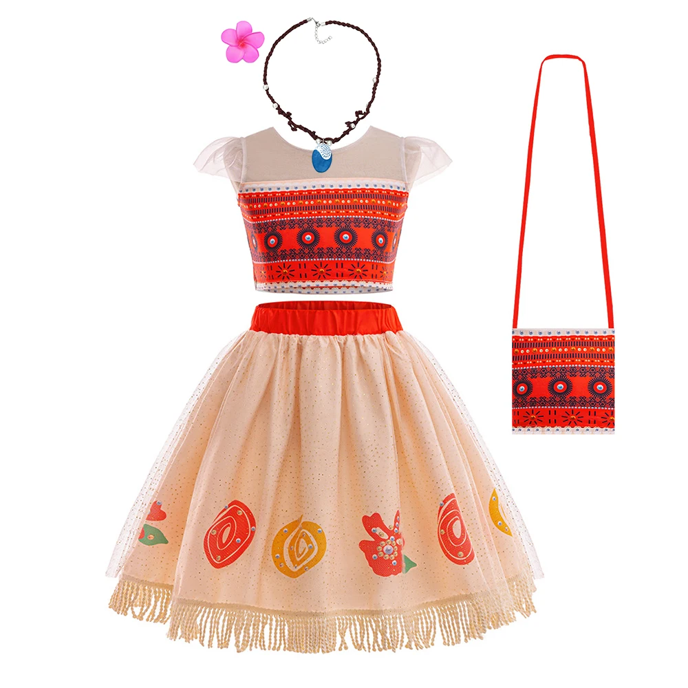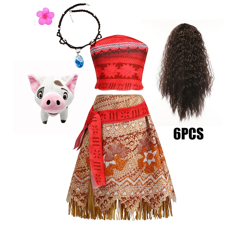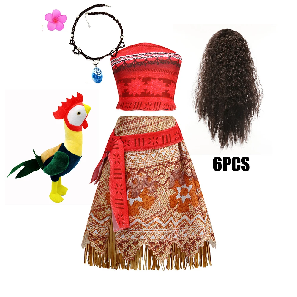 Movie Mona Dress for Kids Girls Princess Viana Cosplay Children Birthday Party Halloween Necklace Pet Pig Chicken Set Full Print