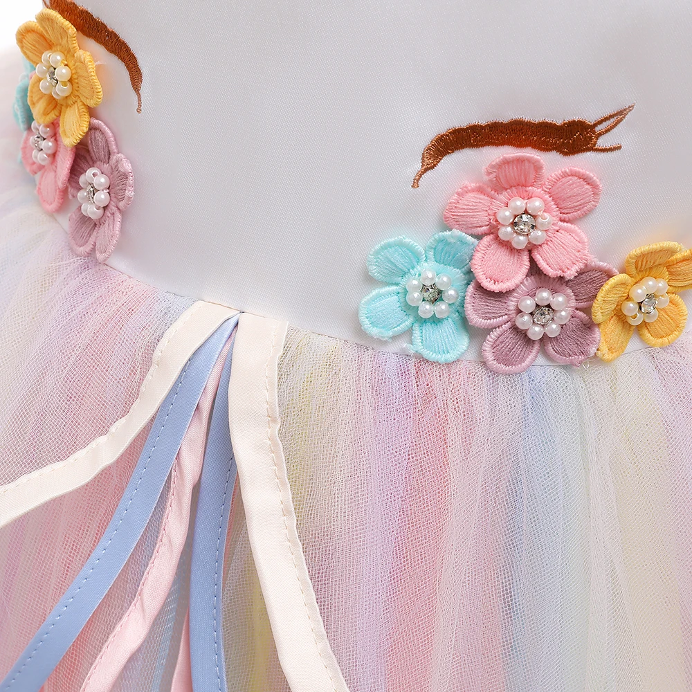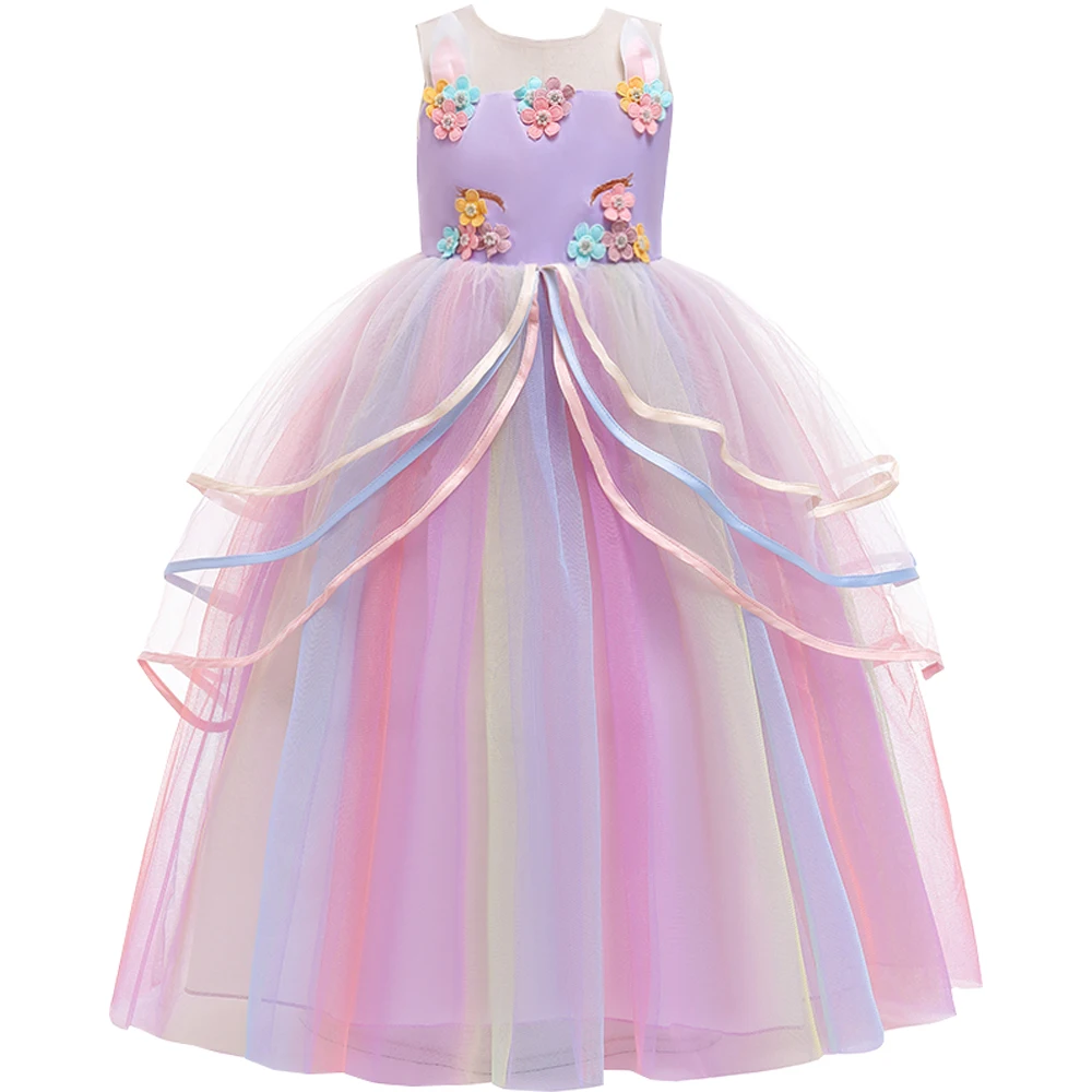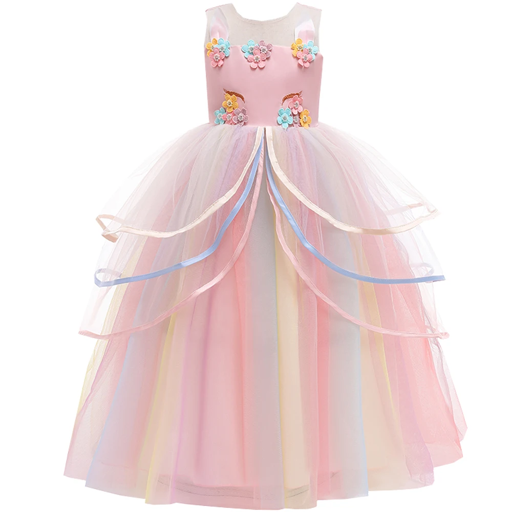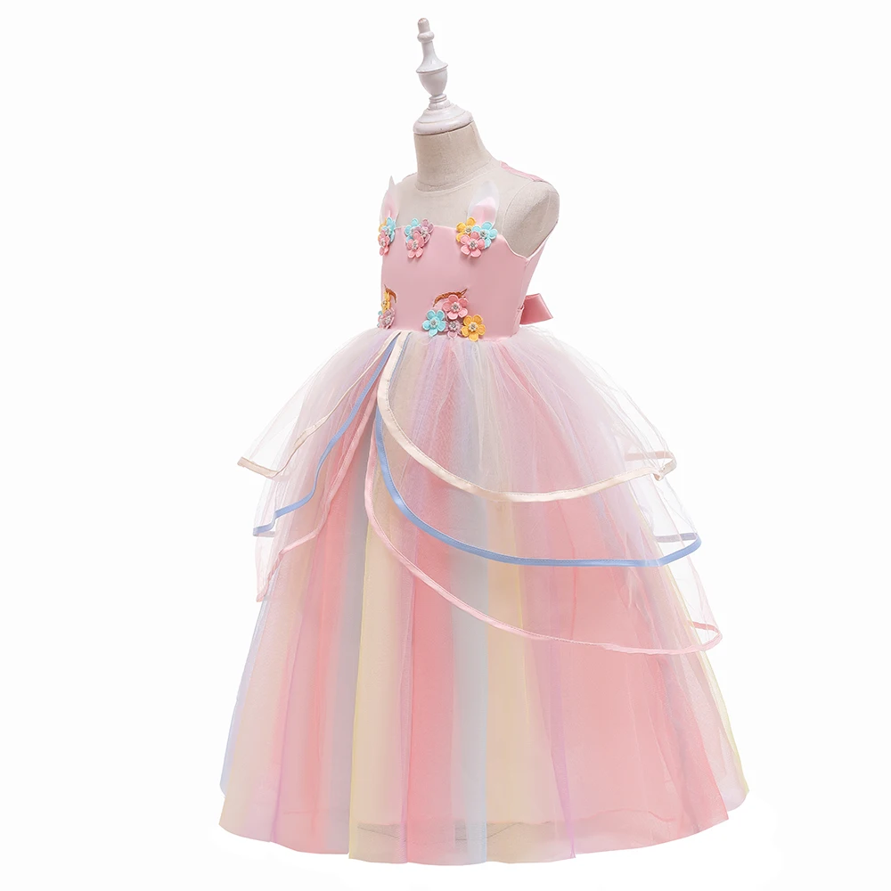 Summer Rainbow Unicorn Girls Dress Cosplay Costume Flower Appliques Birthday Party Kids Dresses for Girl Bridemaid Princess Gown
