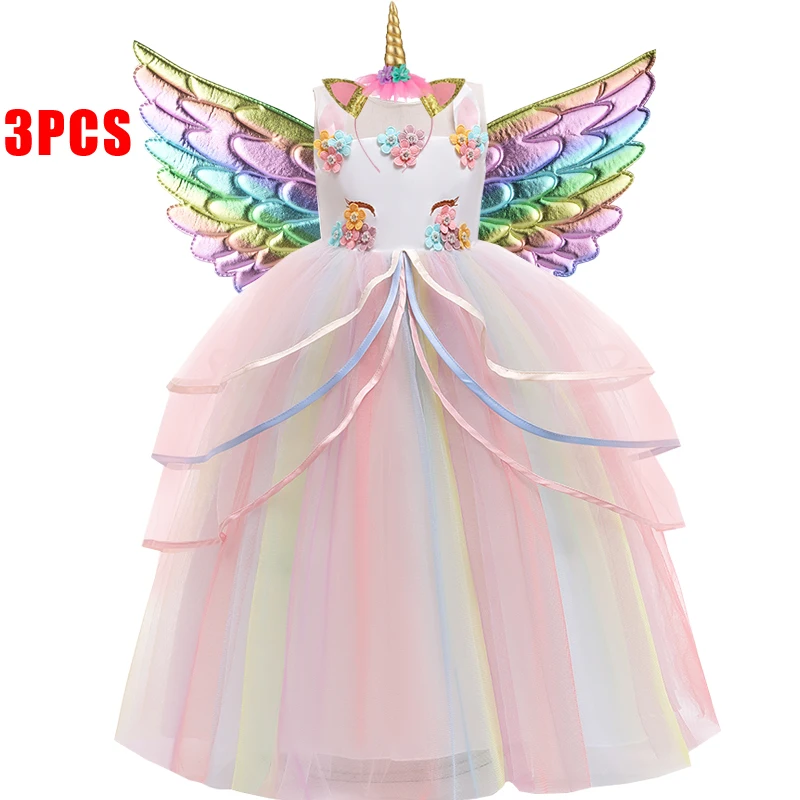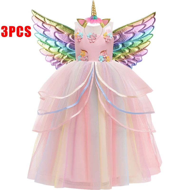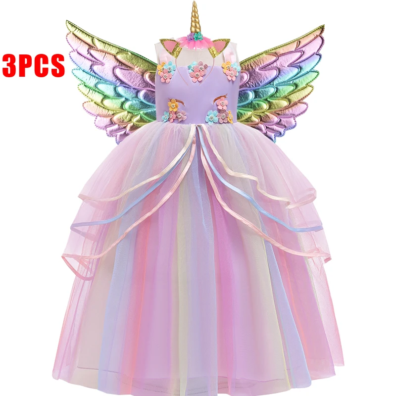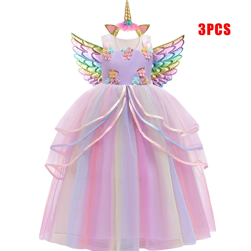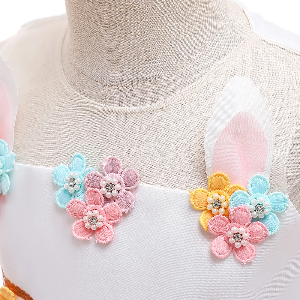 Summer Rainbow Unicorn Girls Dress Cosplay Costume Flower Appliques Birthday Party Kids Dresses for Girl Bridemaid Princess Gown