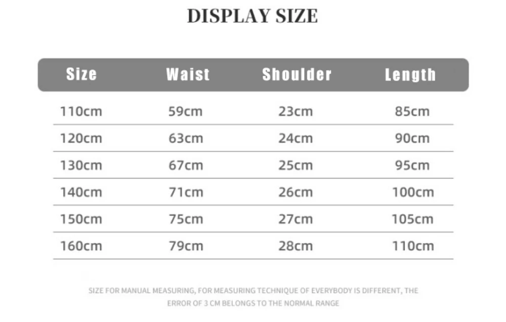 | Kid Size | 140 (7-8 Years), 150 (9-10 Years), 120 (5 Years), 130 (6 Years), 110 (3-4 Years), 160 (11-12 Years) |
