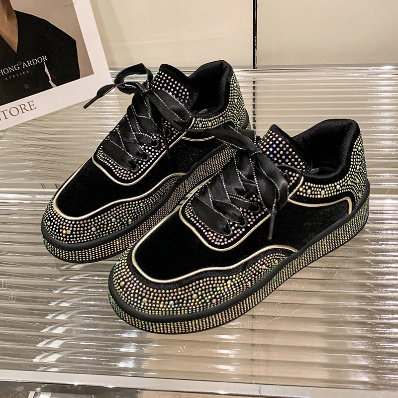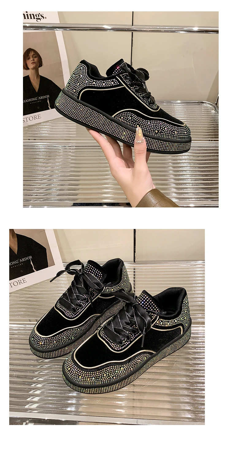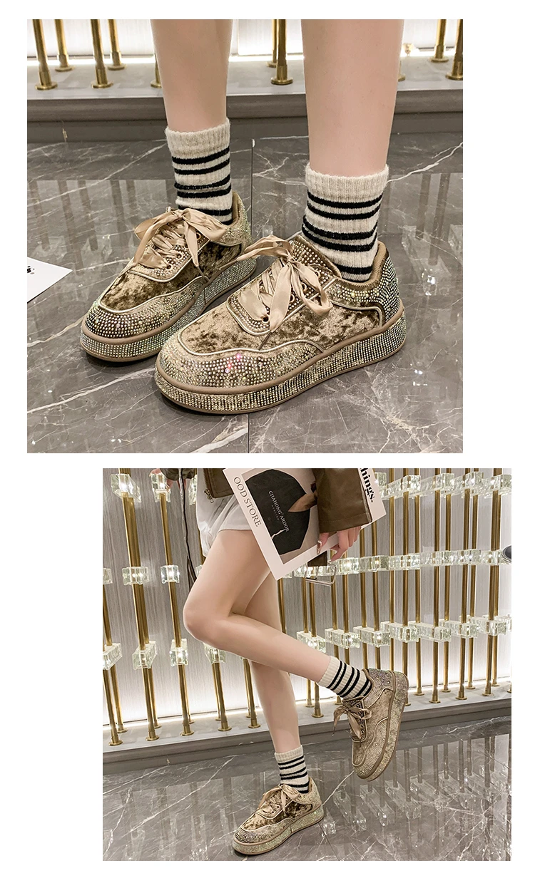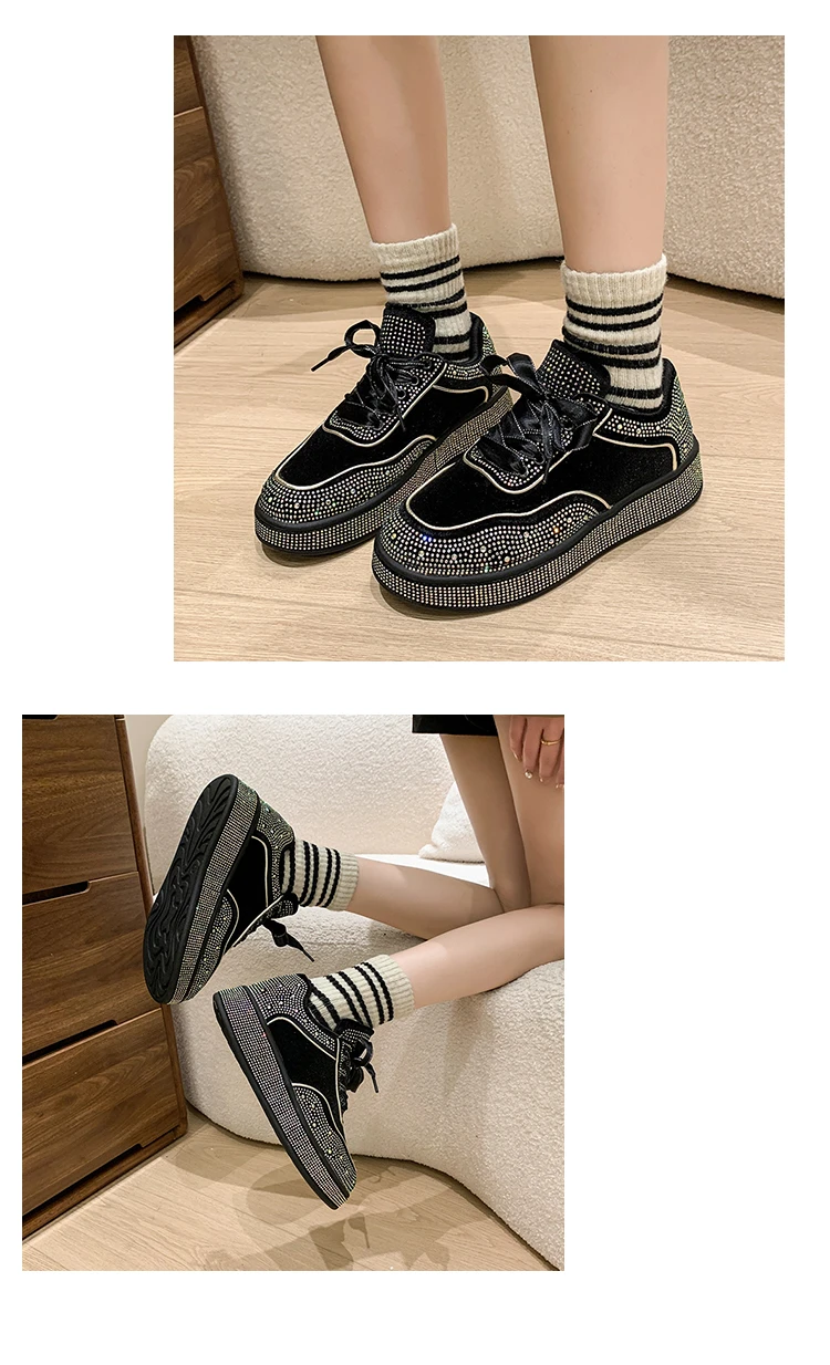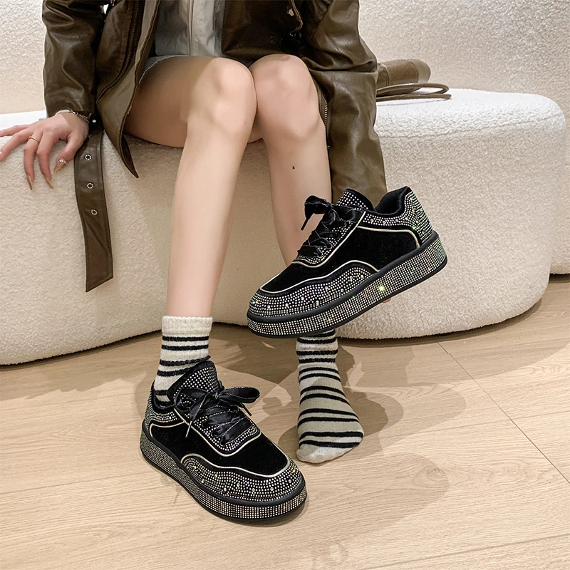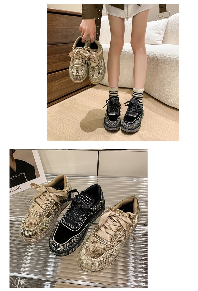 Women’s Designer Water Diamond Suede Casual Shoes Fashion Thick Bottom Lace up Sports Shoes High Quality Flat Vulcanized Shoes