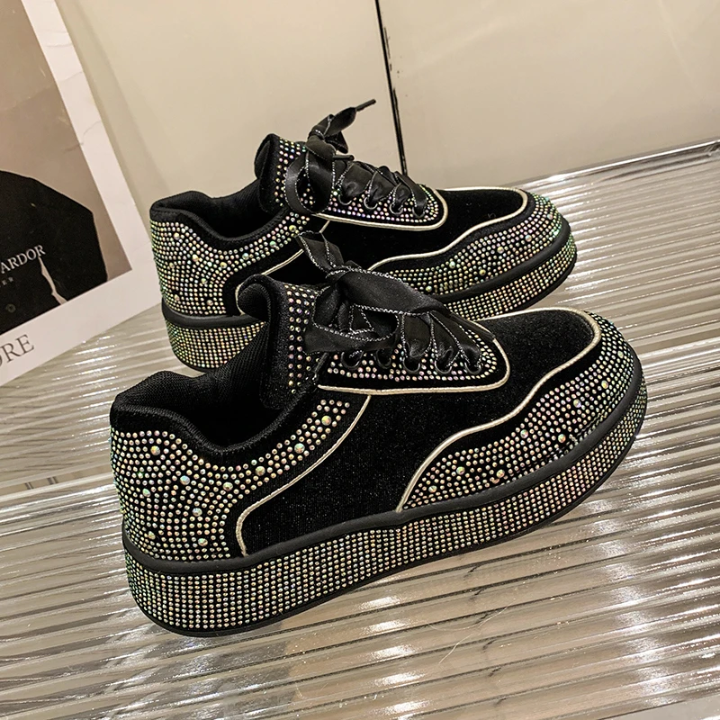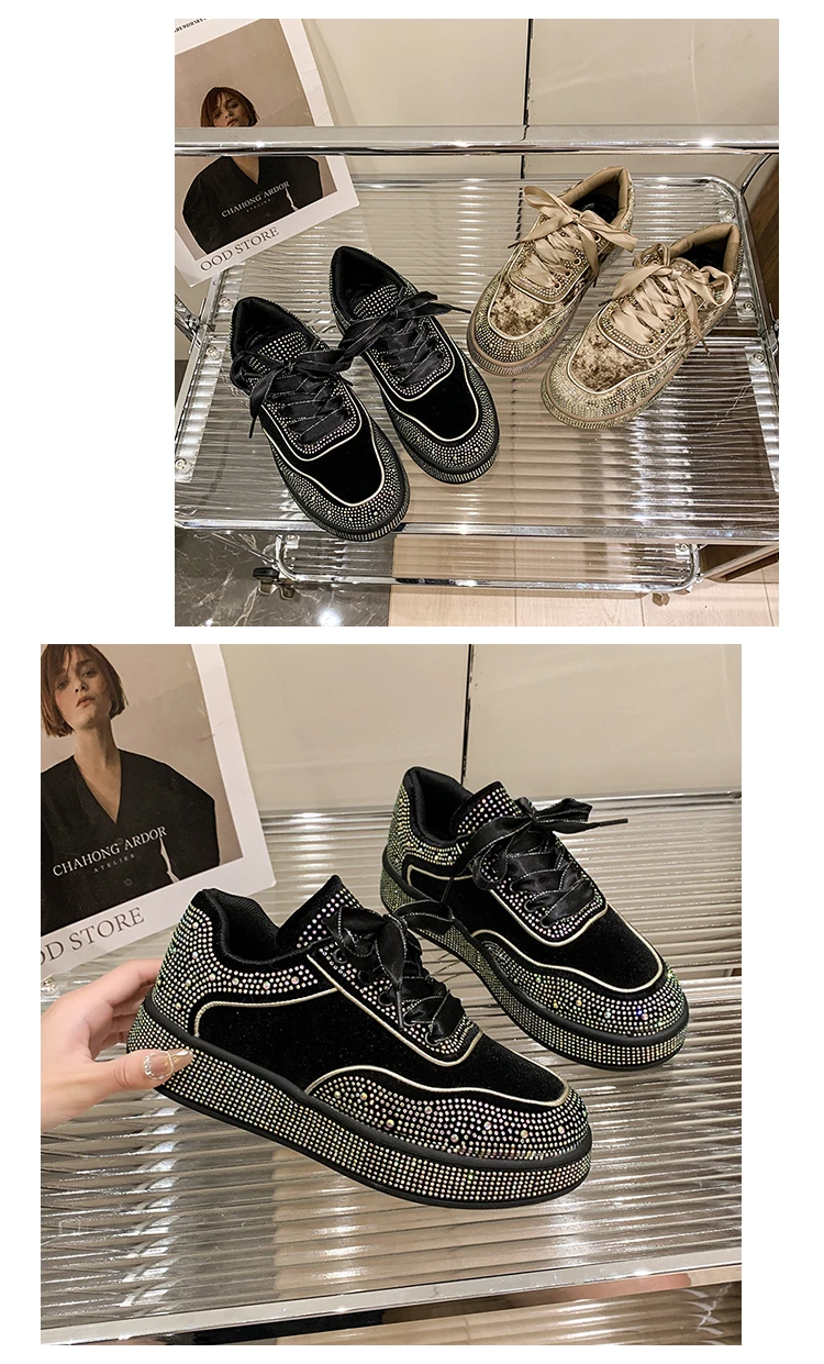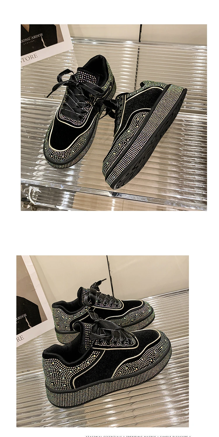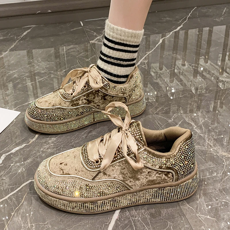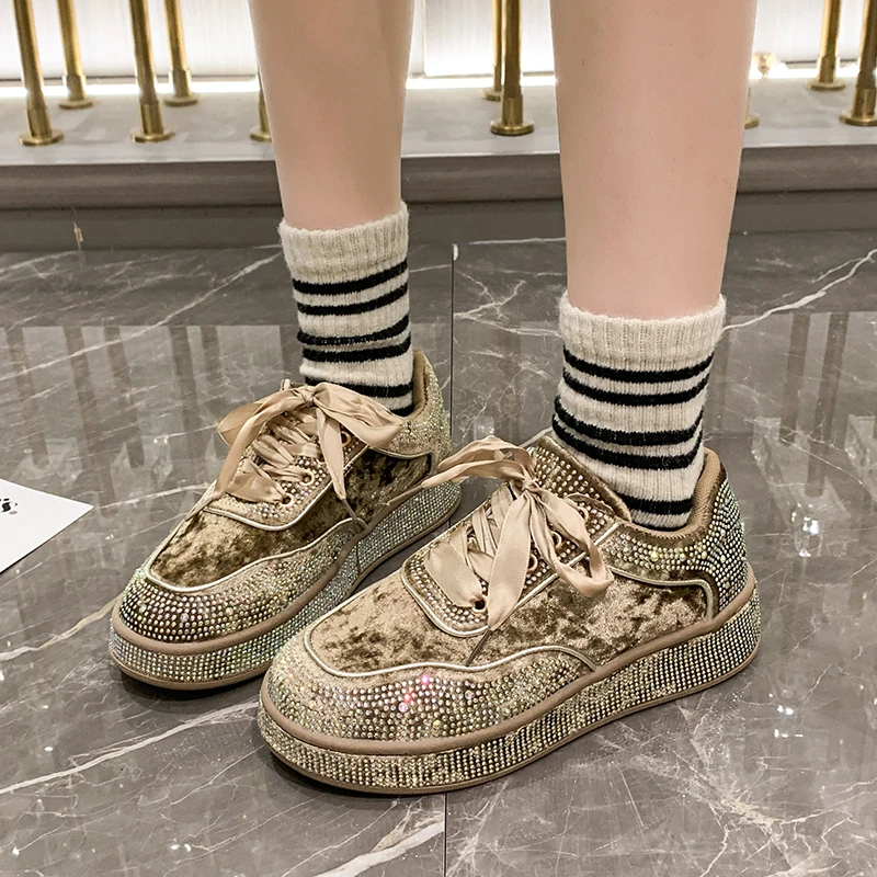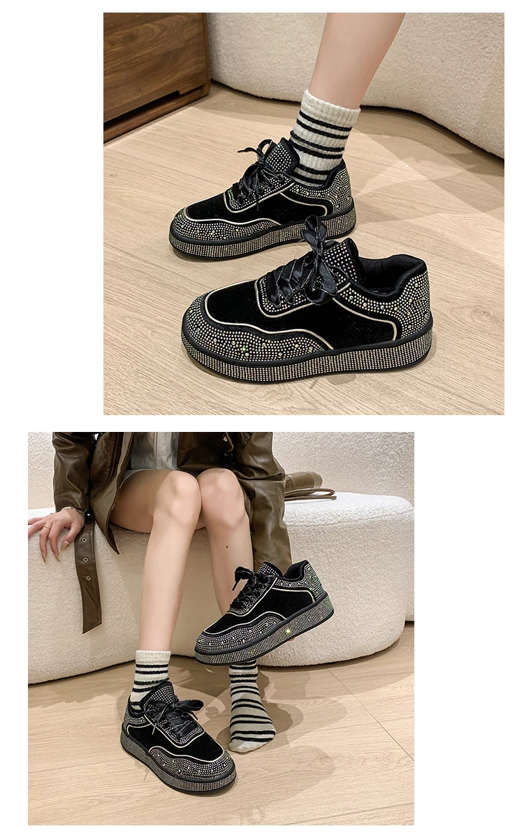 Women’s Designer Water Diamond Suede Casual Shoes Fashion Thick Bottom Lace up Sports Shoes High Quality Flat Vulcanized Shoes