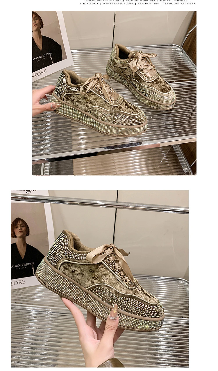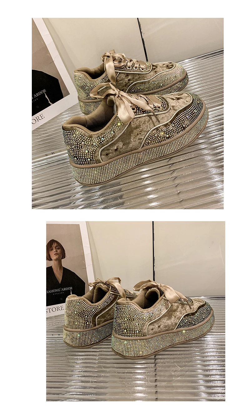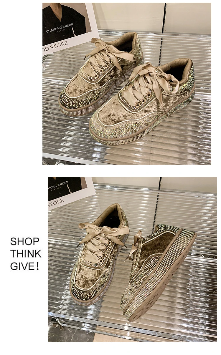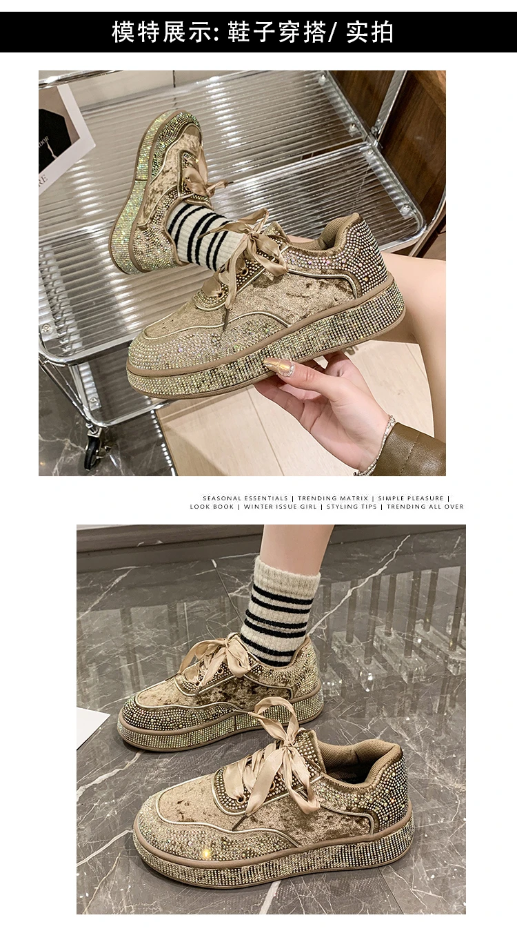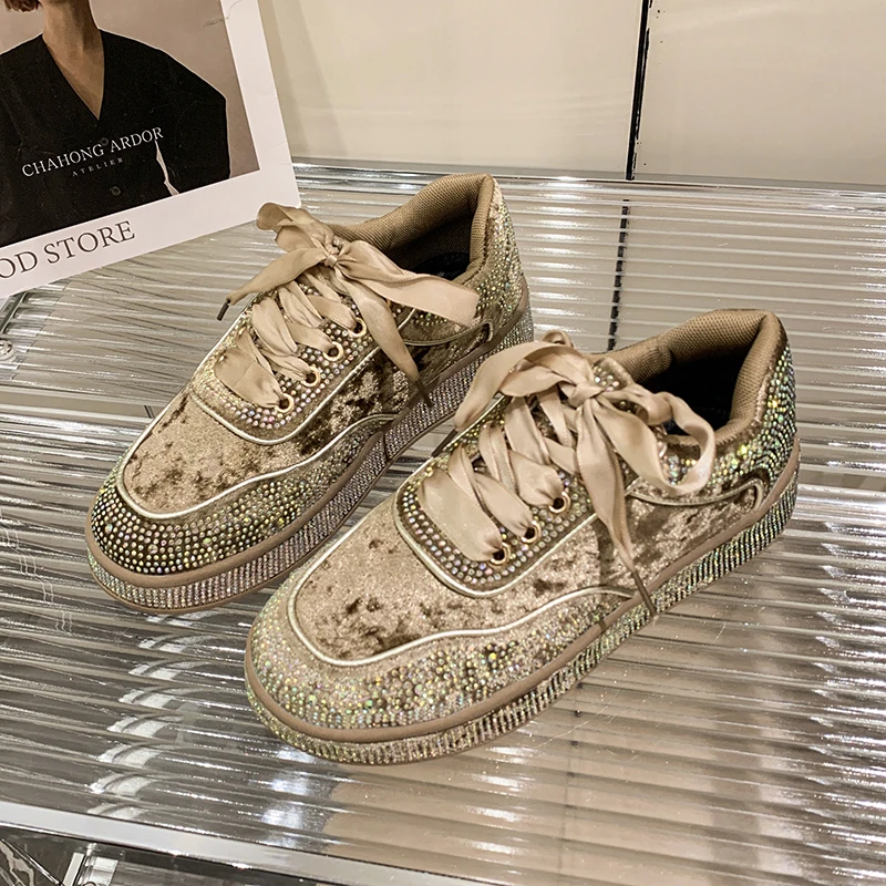 Women’s Designer Water Diamond Suede Casual Shoes Fashion Thick Bottom Lace up Sports Shoes High Quality Flat Vulcanized Shoes