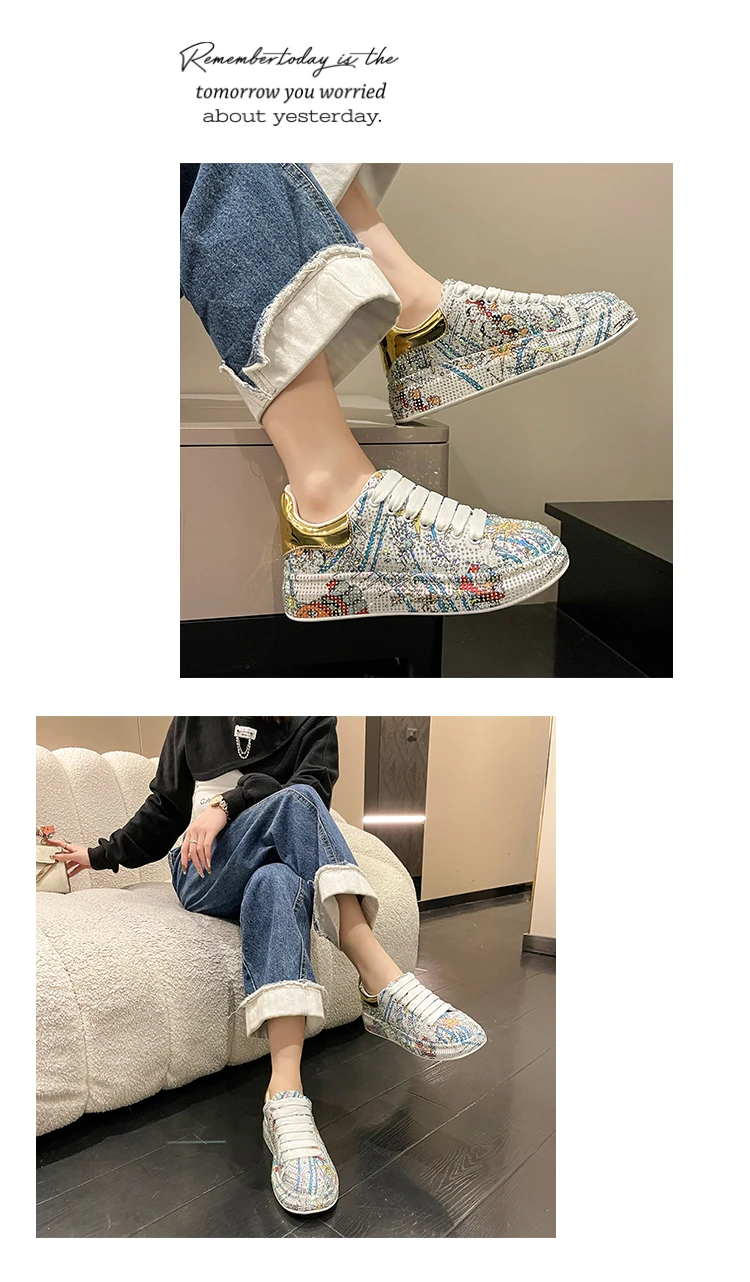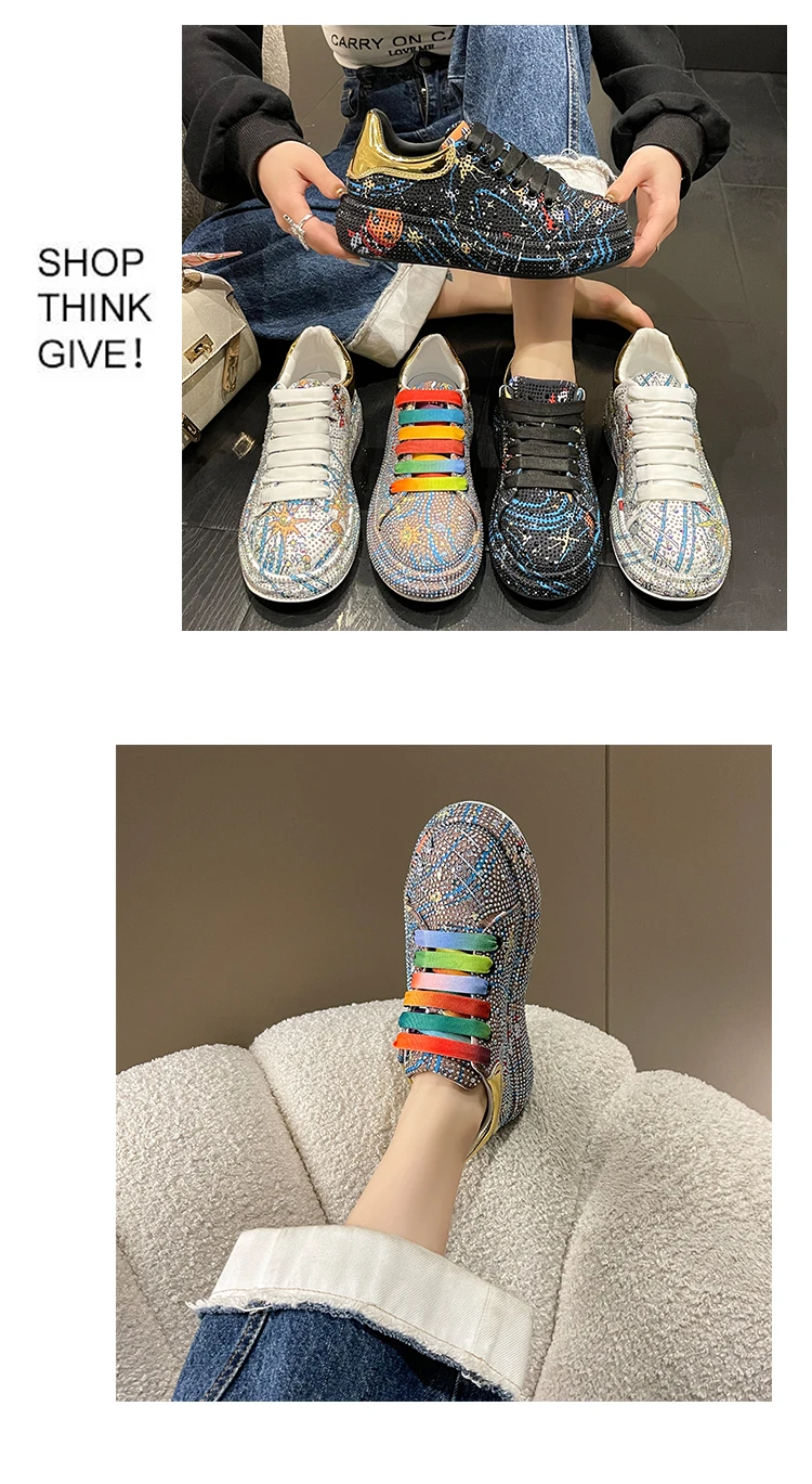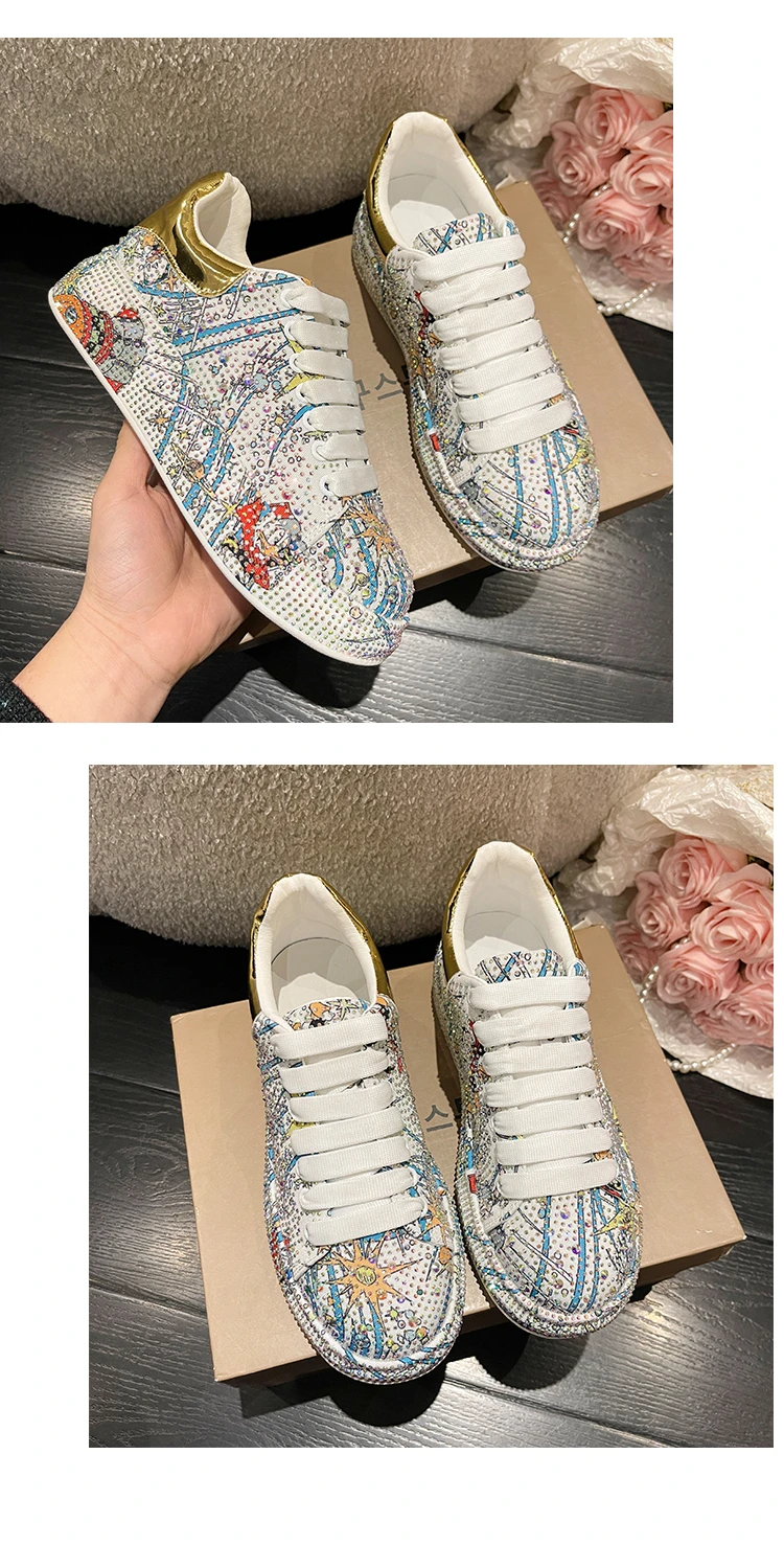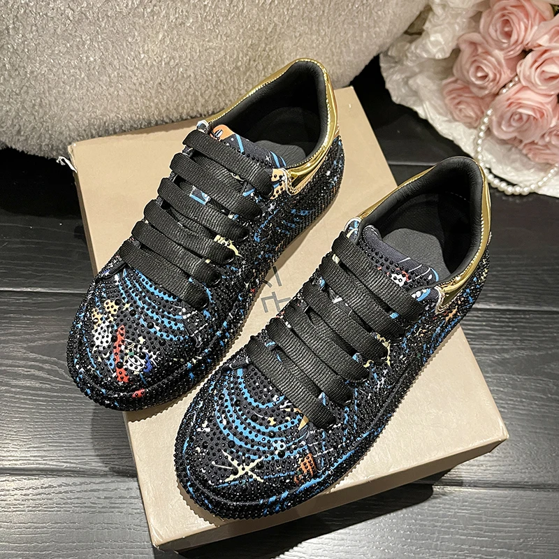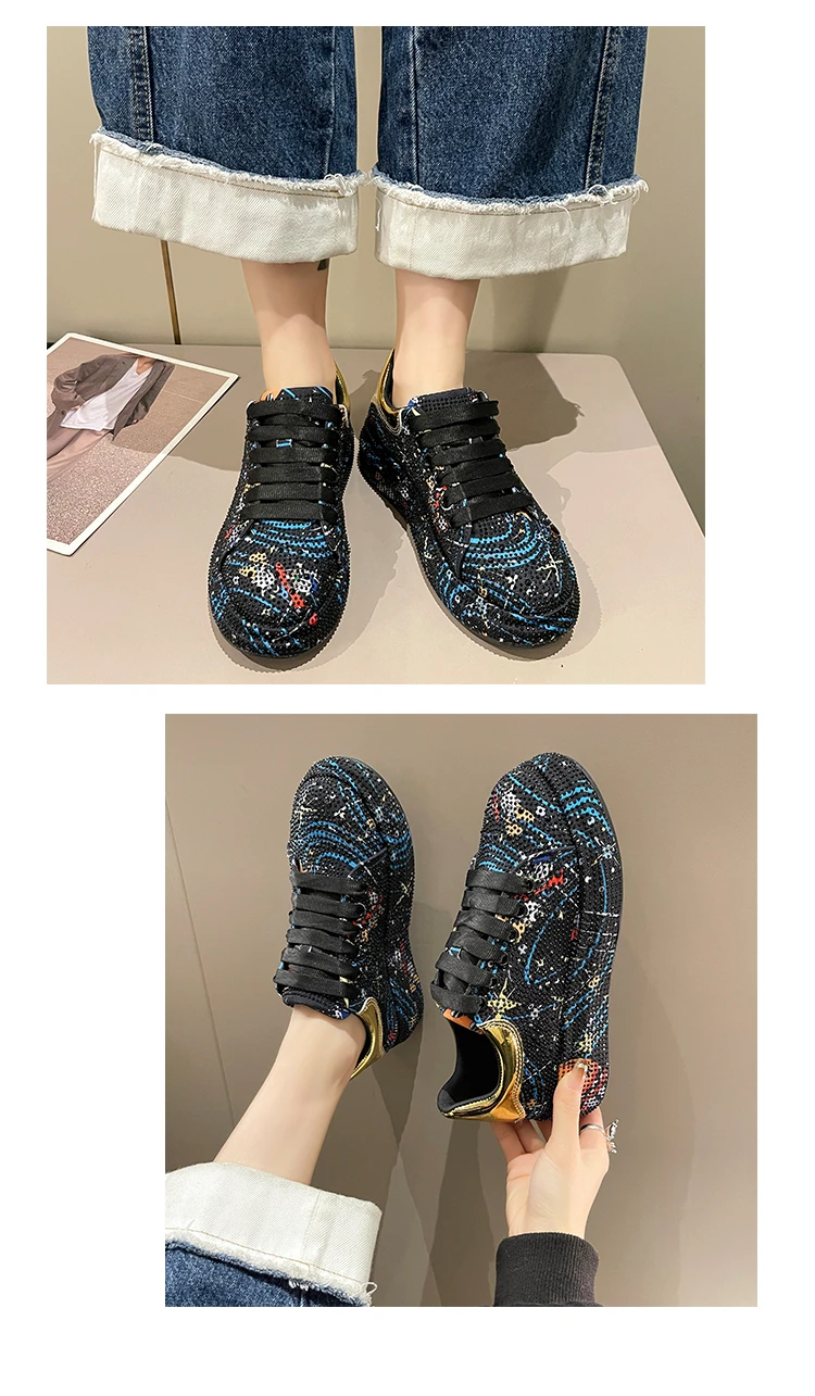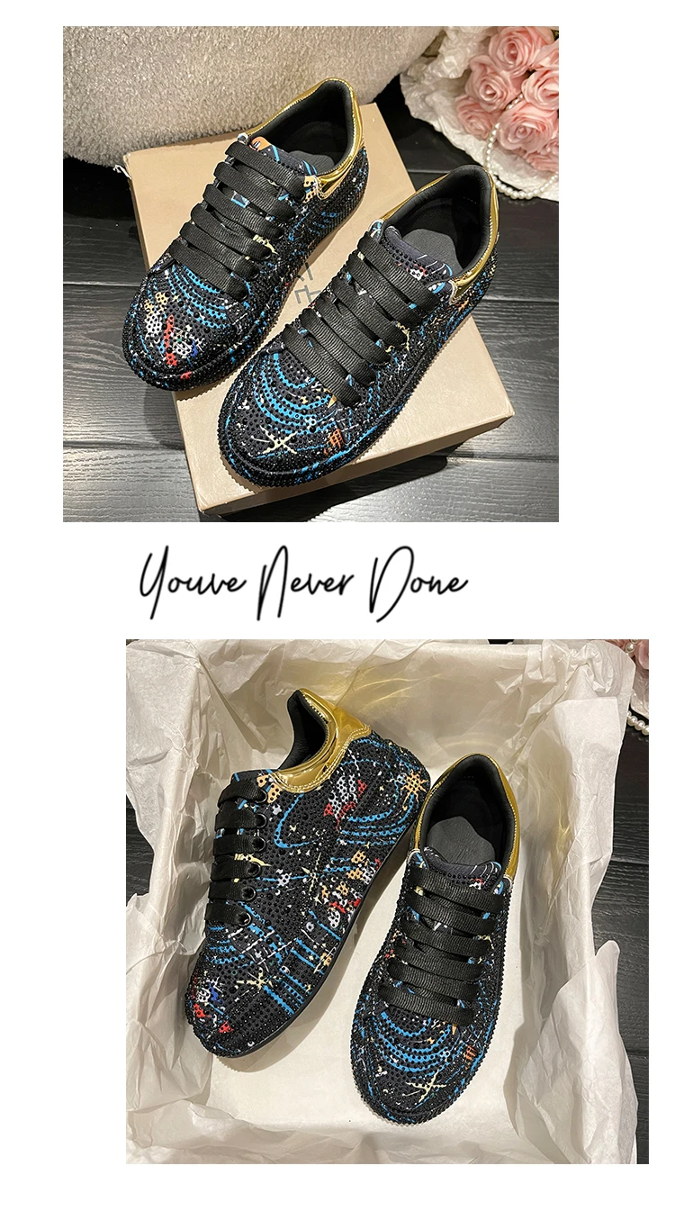 Women’s Luxury Shiny Water Diamond Graffiti Casual Shoes Fashion Thick Bottom Anti slip Sports Shoes Lace-up Designer Flat Shoes
