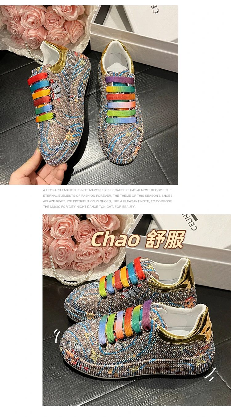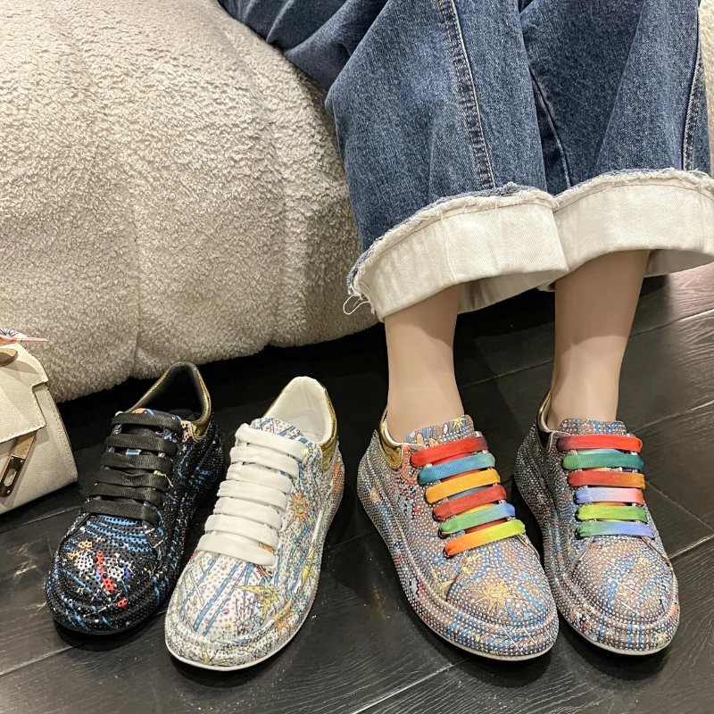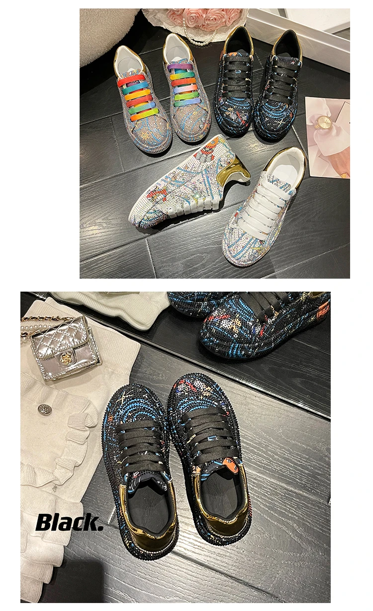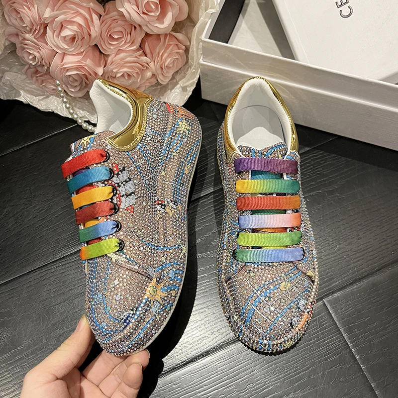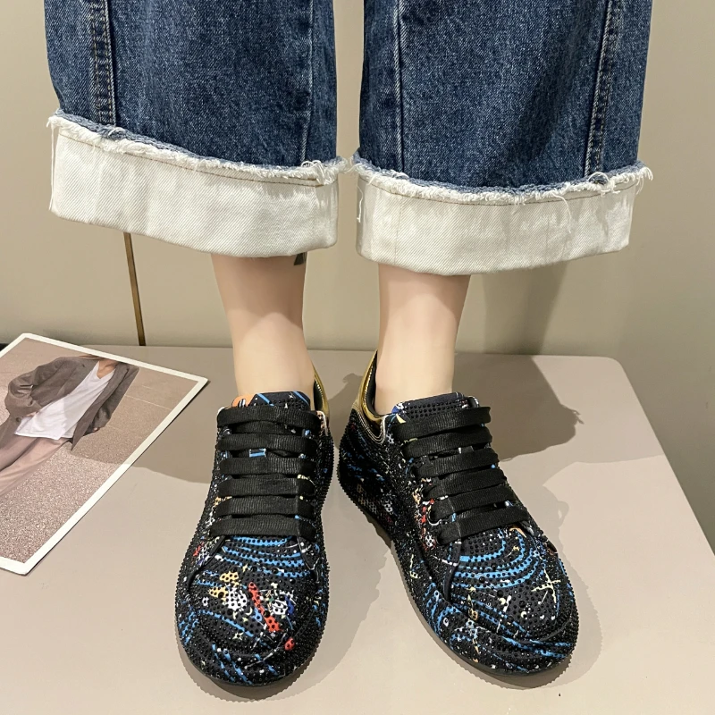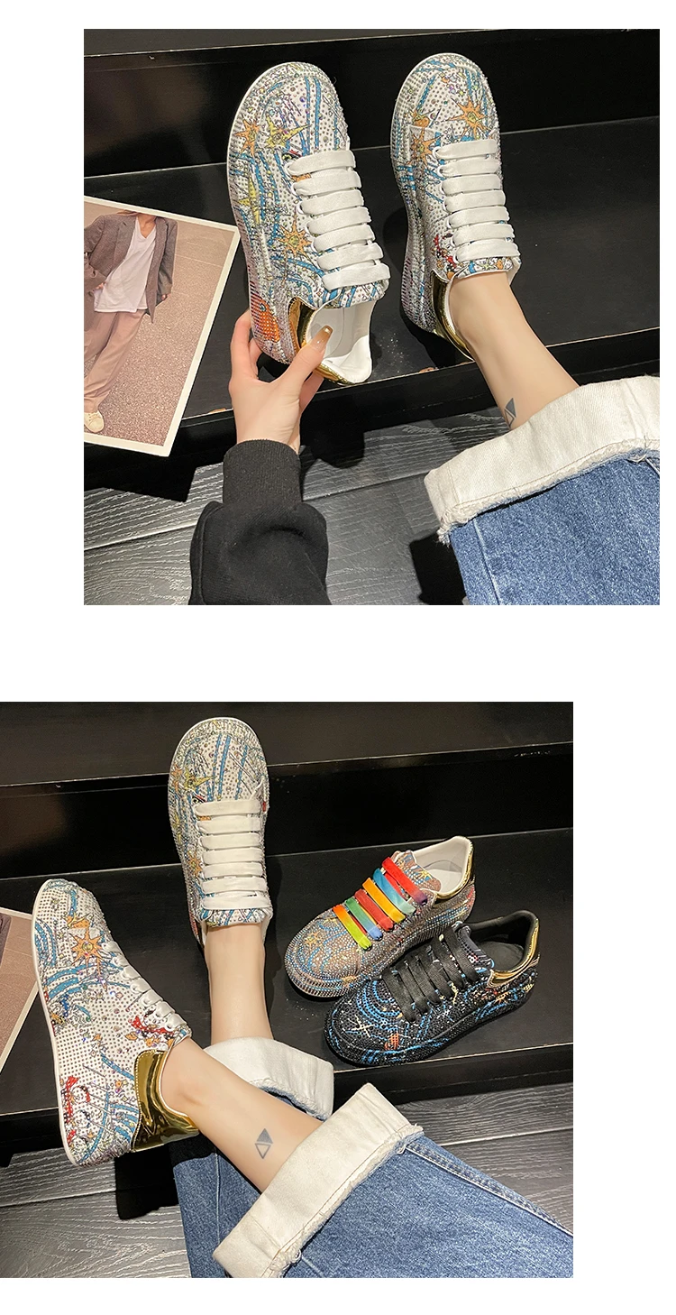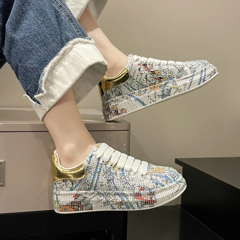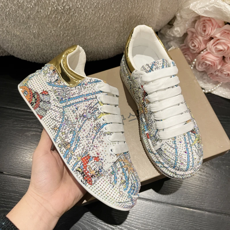 Women’s Luxury Shiny Water Diamond Graffiti Casual Shoes Fashion Thick Bottom Anti slip Sports Shoes Lace-up Designer Flat Shoes