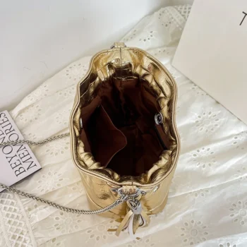 Fashion Tassel Shoulder Bag For Women Brand Designer Handbag And Purse 2024 New Drawstring Bucket Crossbody Bag Mini Bolsas Gold