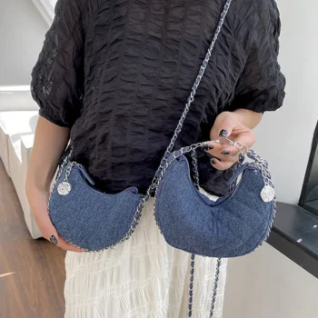 Fashion Denim Women Handbags Chains Lingge Crossbody Bags for Women Half Moon Canvas Shoulder Bag Ladies Purses Tote Clutch Chic